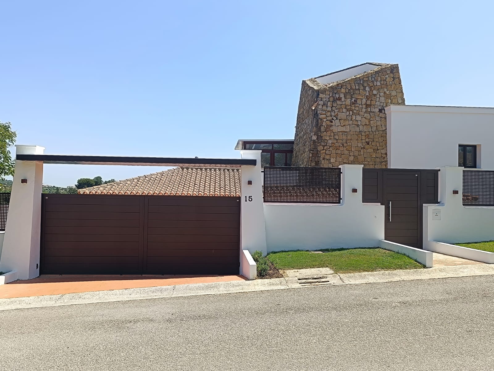 Conjunto formado por Puerta corredera automática de dos hojas + Puerta peatonal en aluminio
